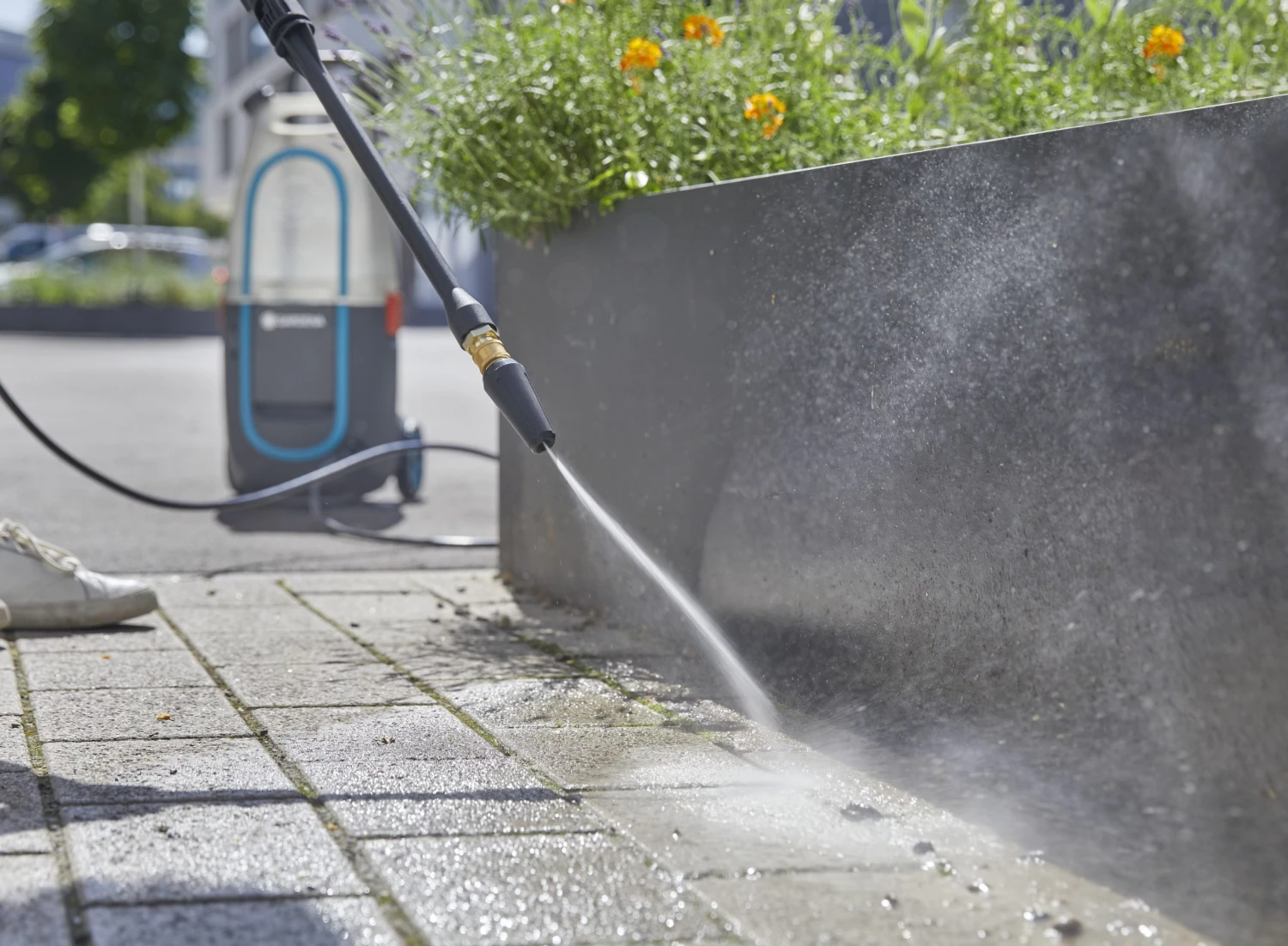 - Le jet d’eau rotatif élimine même les salissures importantes et nettoie, par exemple, les surfaces moussues ou altérées par les intempéries.