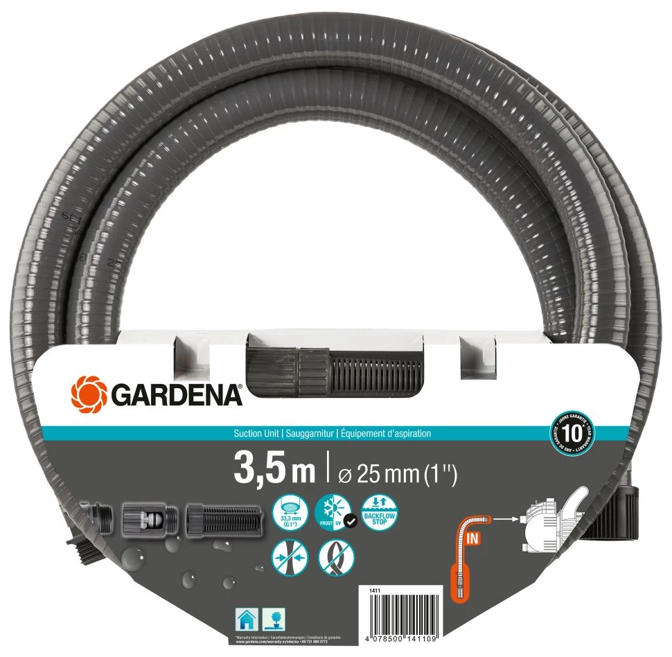 - Le tuyau a une longueur de 3,5 m, un diamètre de 25 mm (1″) et convient aux pompes avec un filetage extérieur de 33,3 mm (G 1).